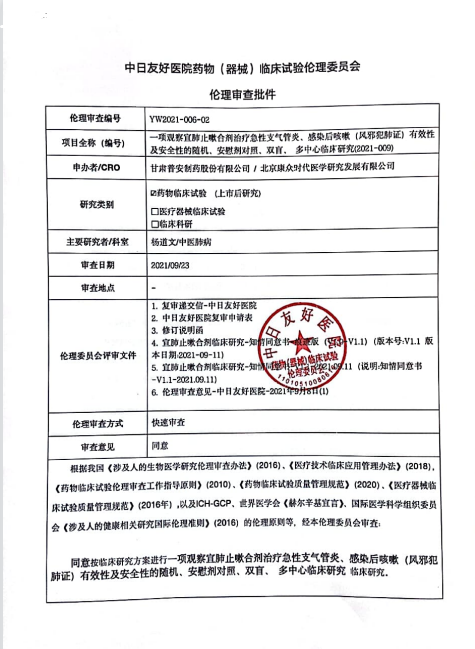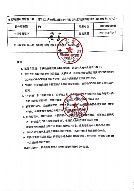 項目所屬的有效性RCT臨床試驗研究于2021年9月24日通過組長單位(中日友好醫院)的倫理審查,并于9月27日取得倫理批件。其他研究中心正以組長單位倫理批件為前置條件有序完成項目立項和倫理立項,近日已有4家分中心陸續拿到倫理批件,其中白山市中醫院率先完成兩例受試者入組,標志著有效性RCT臨床試驗研究項目病例入組工作正式開始。