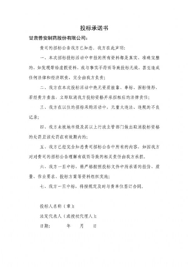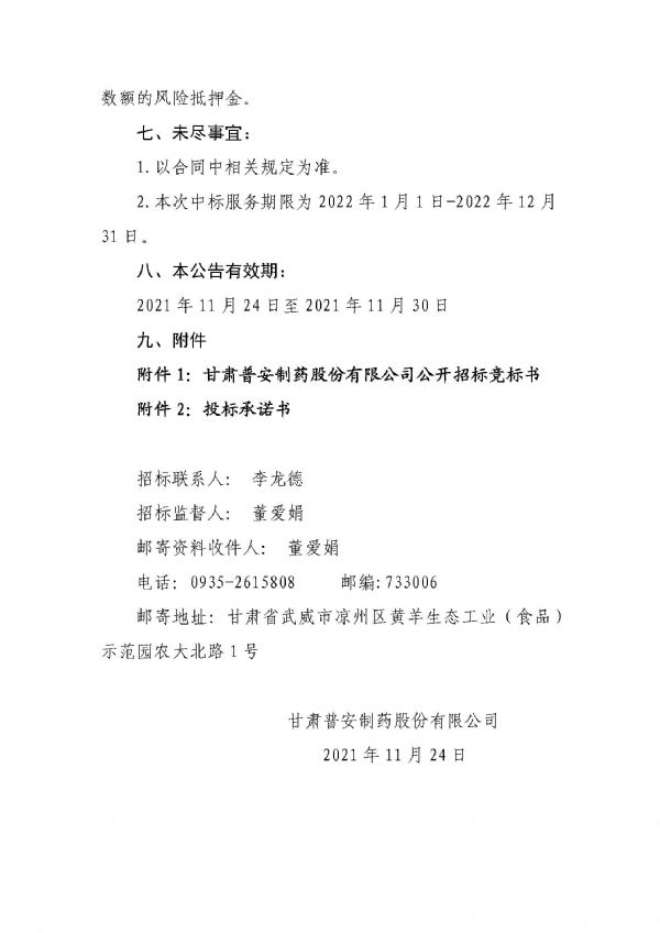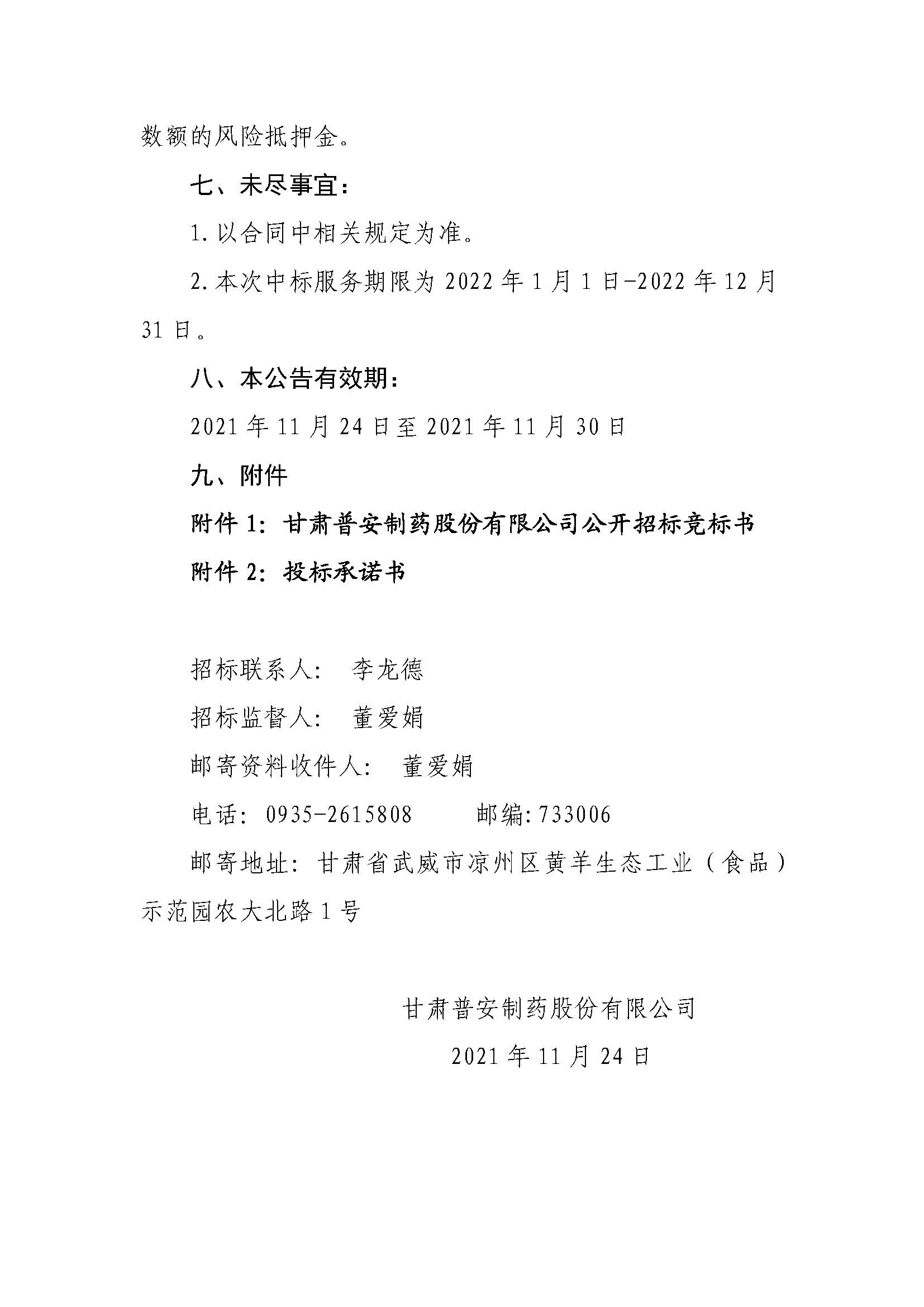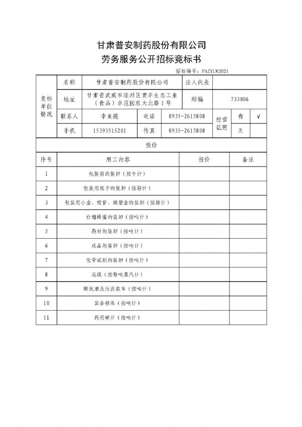 甘肅普安制藥股份有限公司裝卸業務招標公告