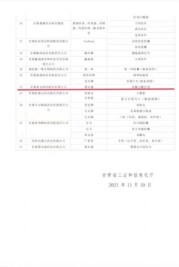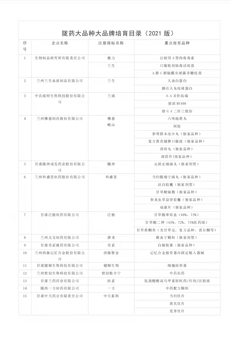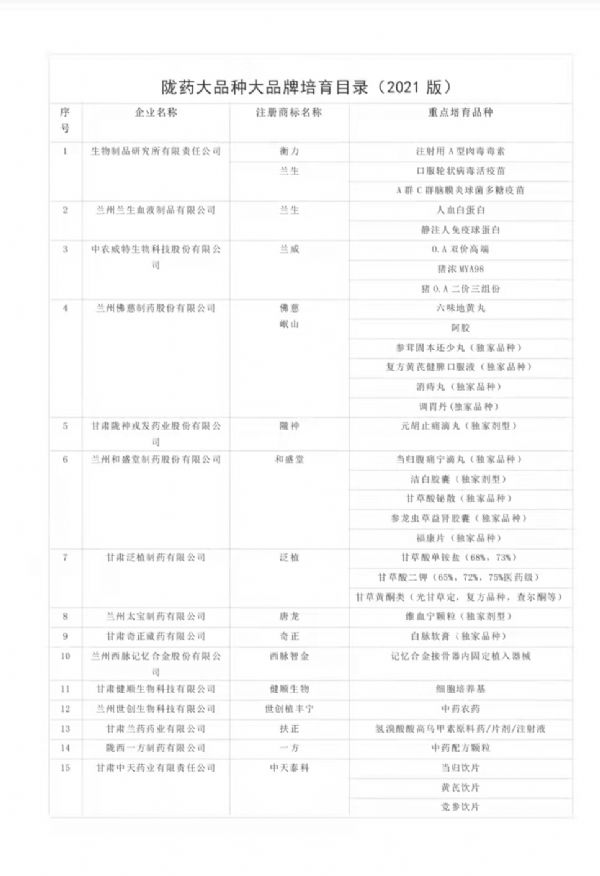 為切實抓好隴藥大品種大品牌培育工作,根據《甘肅省人民政府辦公廳關于支持隴藥大品種大品牌推動龍頭企業發展政策措施的通知》(甘政辦發〔2018〕131號)要求,經公示無異,現將隴藥大品種大品牌培育目錄(2021版)予以公告。