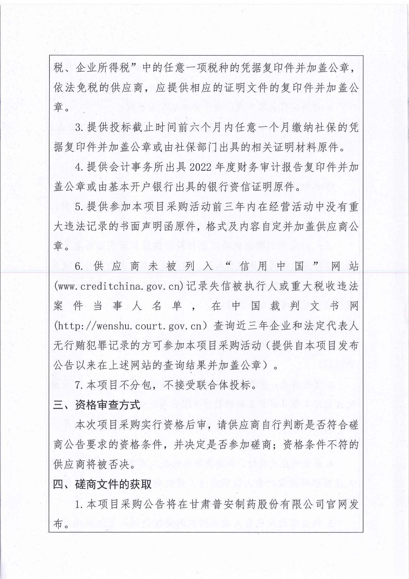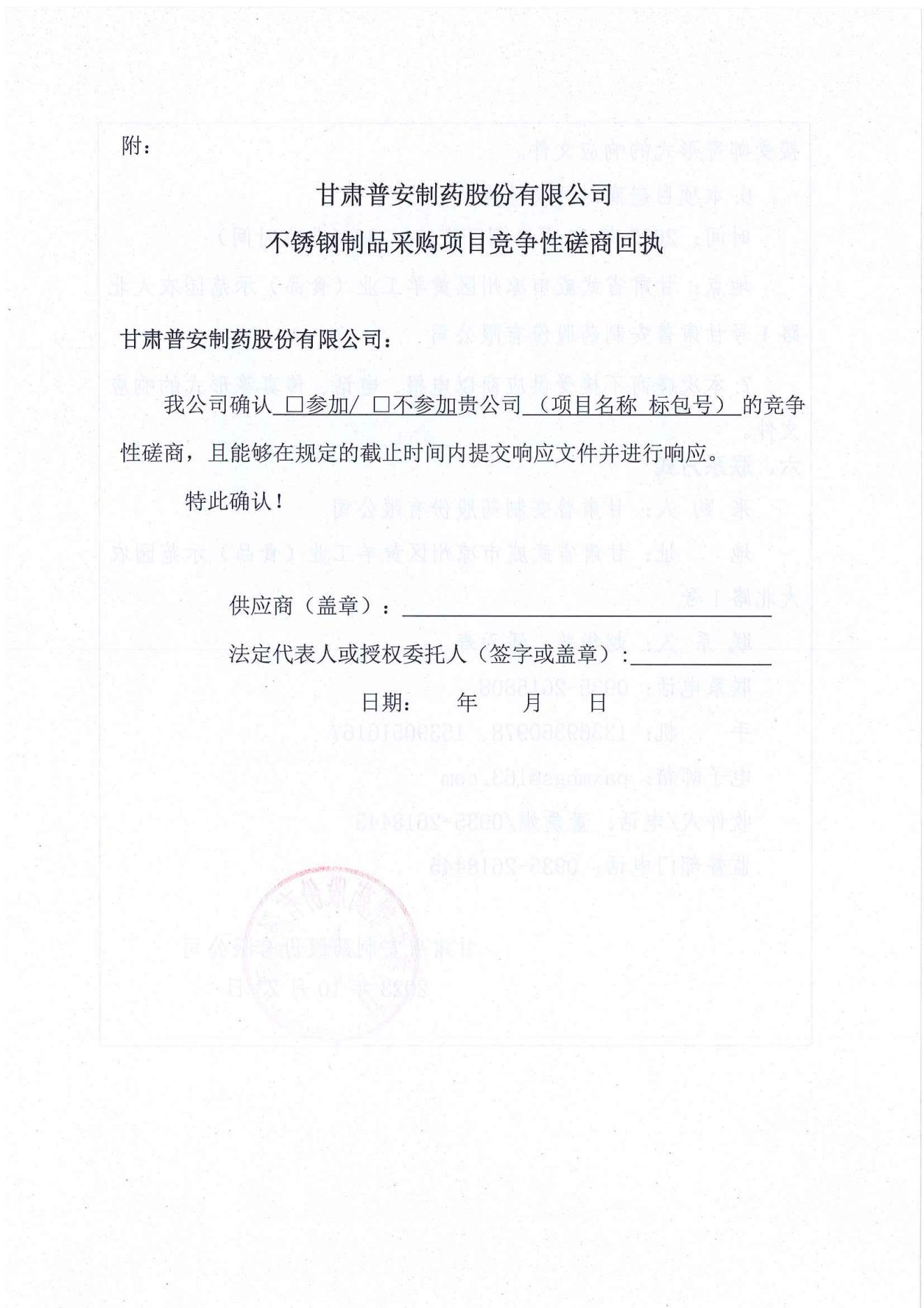 甘肅普安制藥股份有限公司年產(chǎn)5000 萬(wàn)盒(3億支)宣肺止嗽合劑等液體制劑生產(chǎn)線(xiàn)升級(jí)改造項(xiàng)目不銹鋼制品采購(gòu)競(jìng)爭(zhēng)性磋商公告