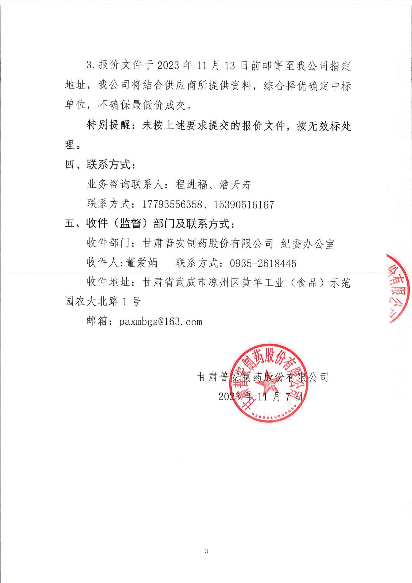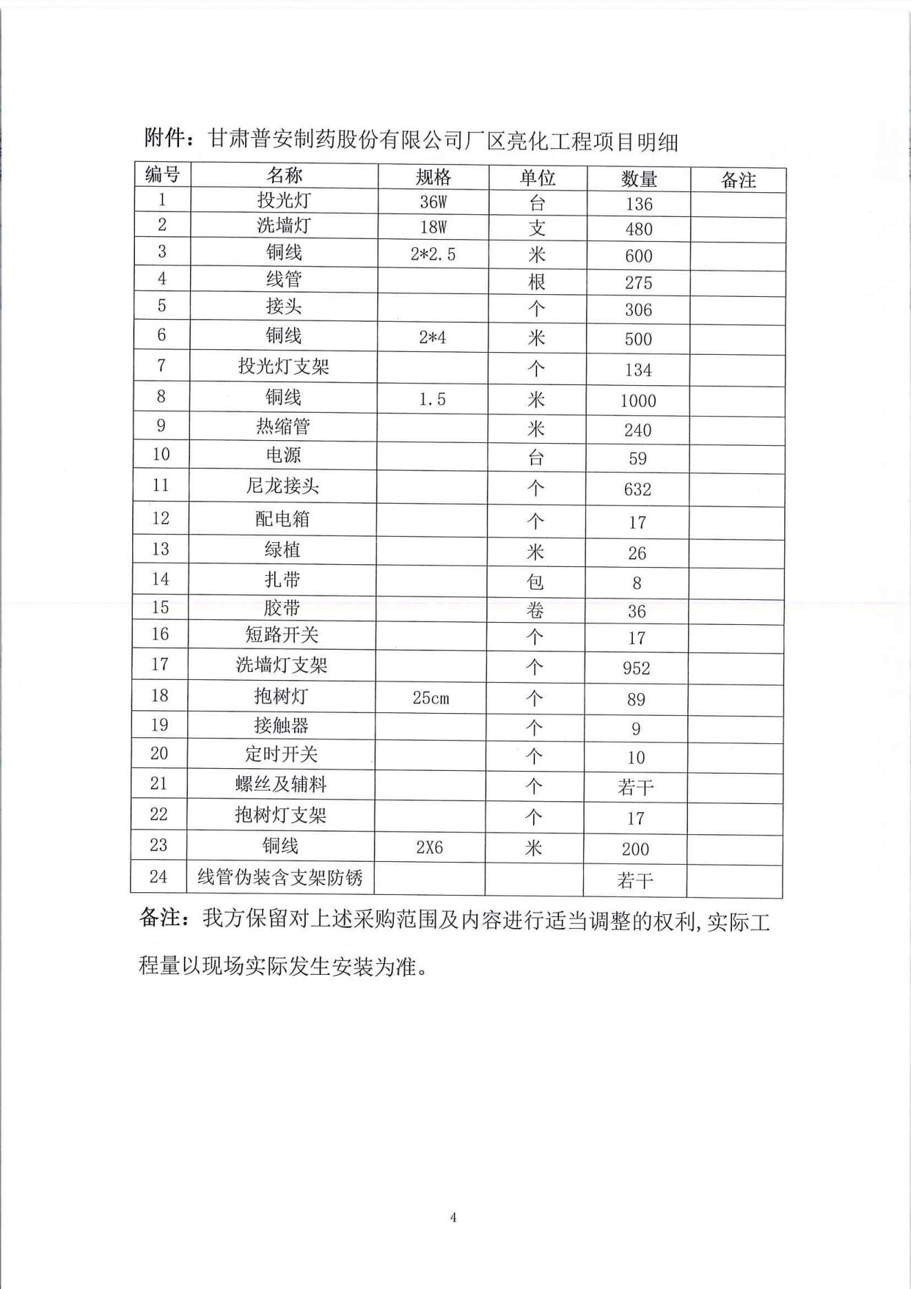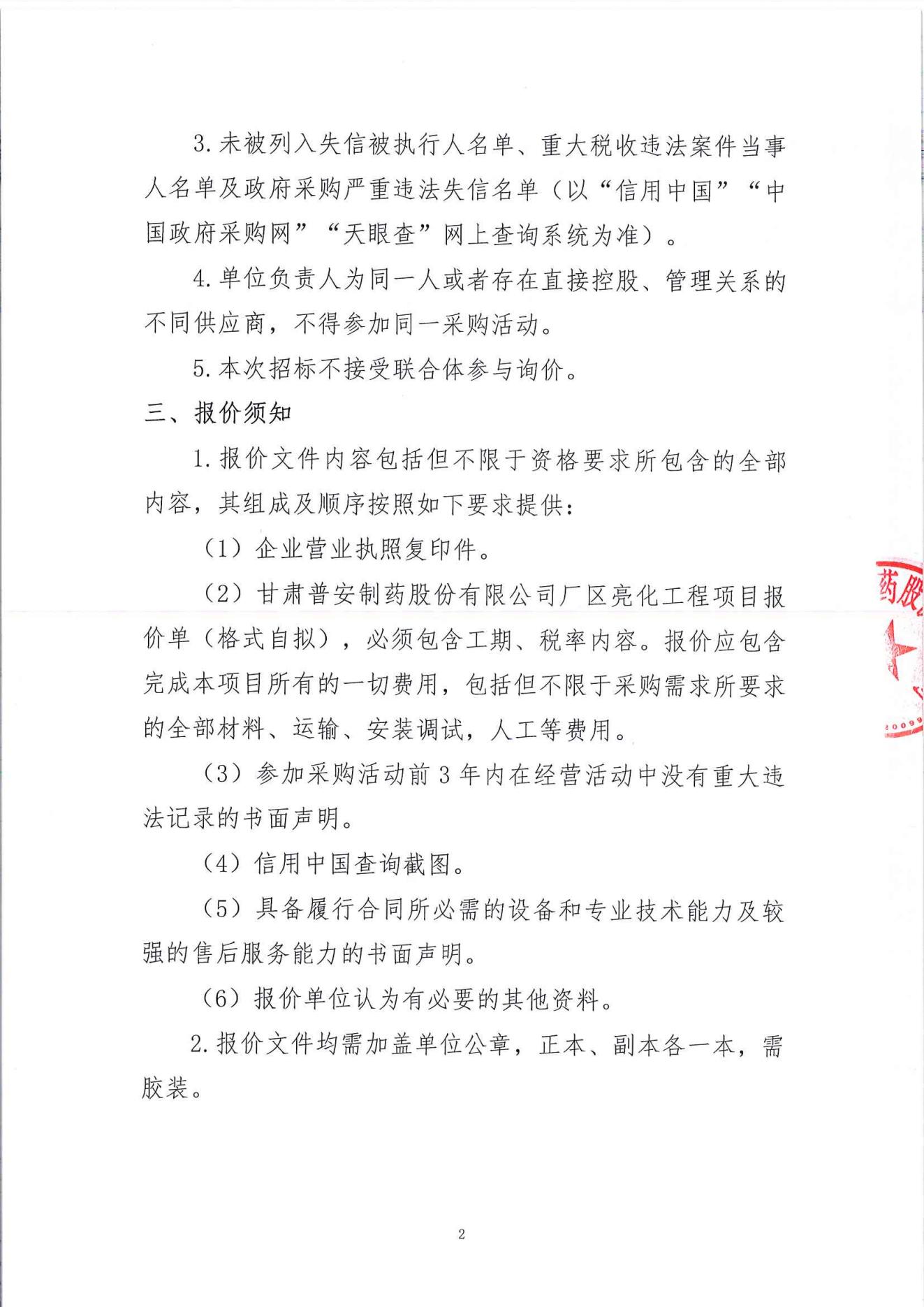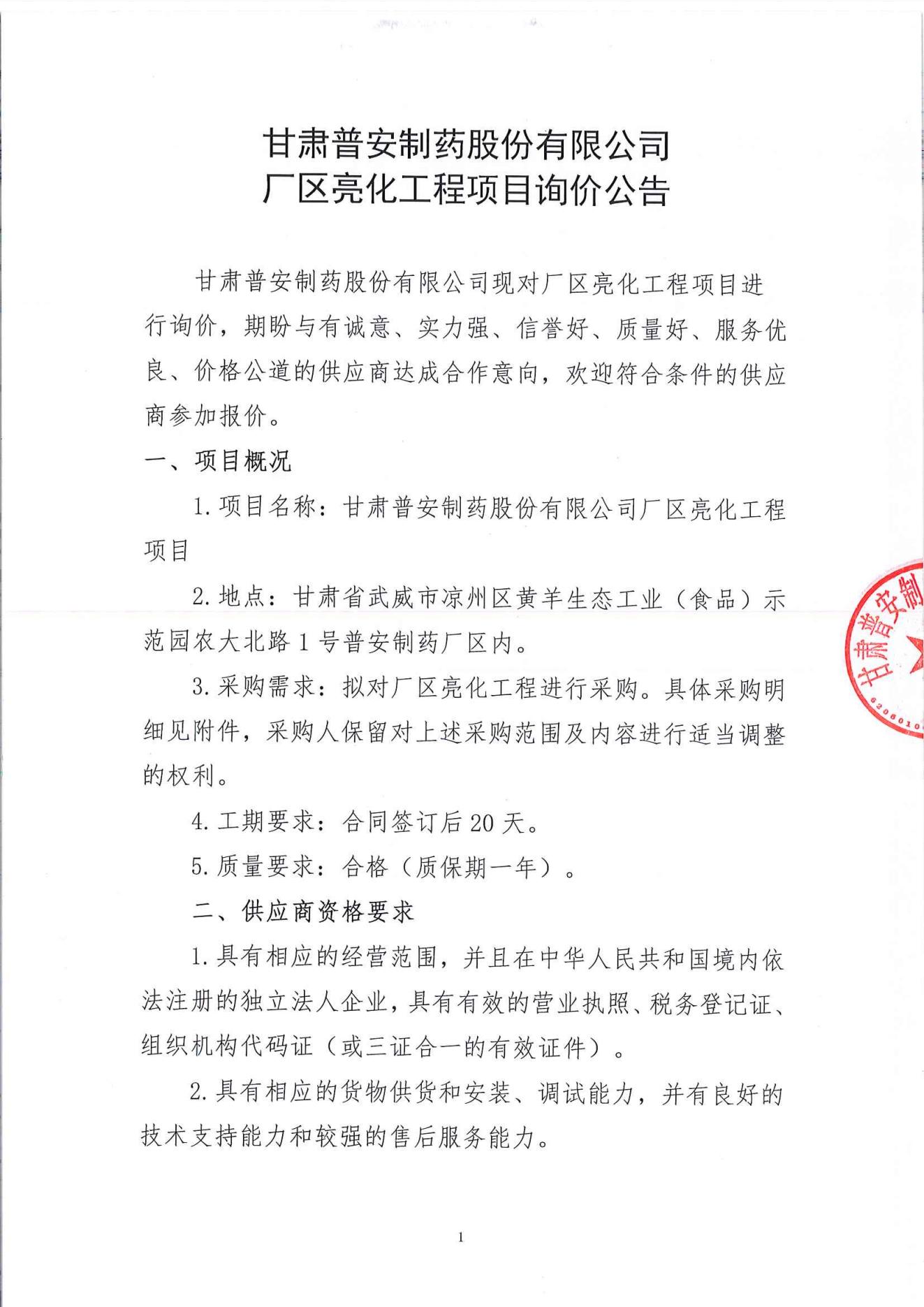 甘肅普安制藥股份有限公司廠區(qū)亮化工程項(xiàng)目詢價(jià)公告