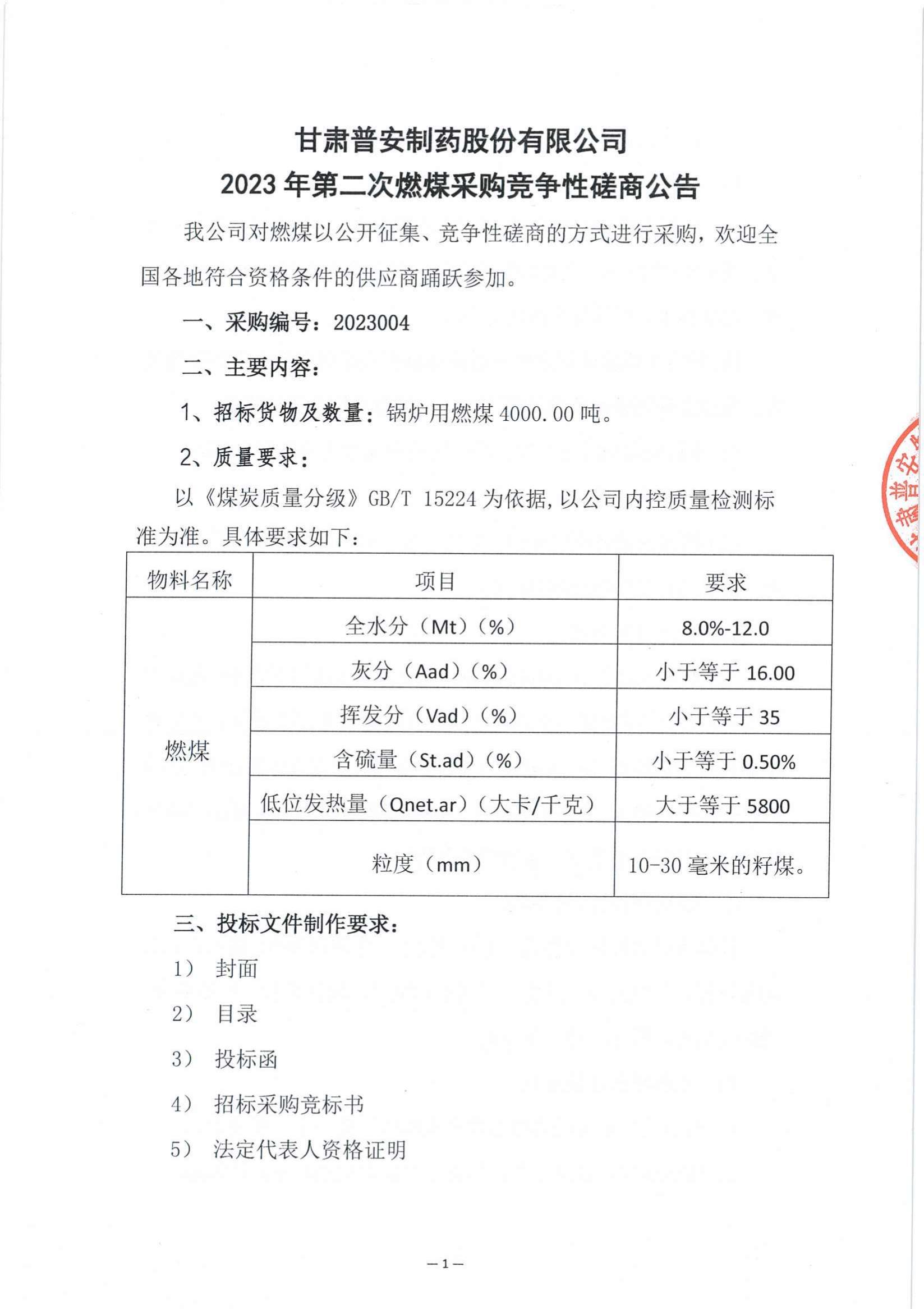 甘肅普安制藥股份有限公司2023年第二次燃煤采購競爭性磋商公告