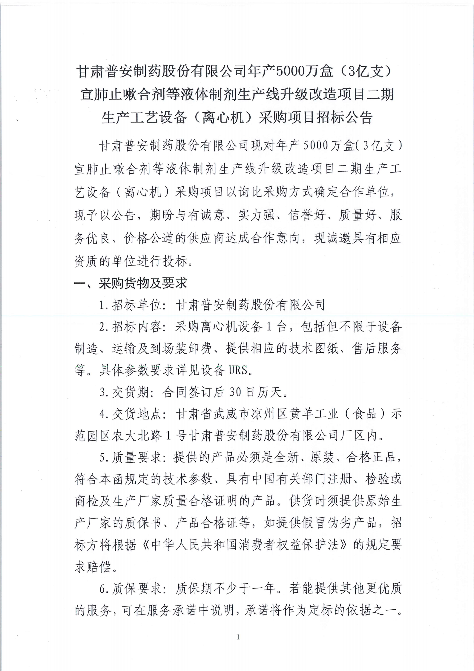 甘肅普安制藥股份有限公司年產5000萬盒(3億支)宣肺止嗽合劑等液體制劑生產線升級改造項目二期生產工藝設備(離心機)采購項目招標公告