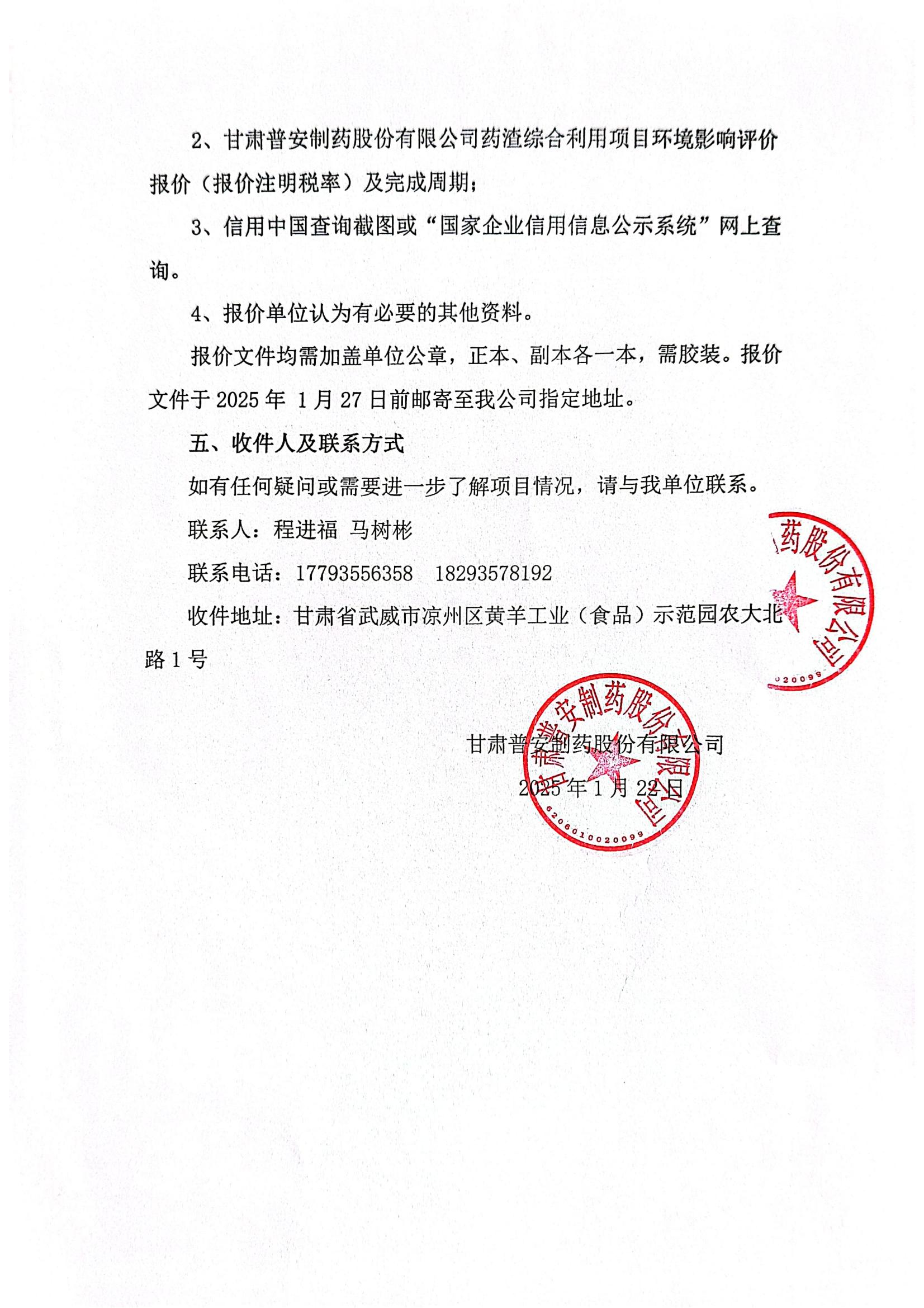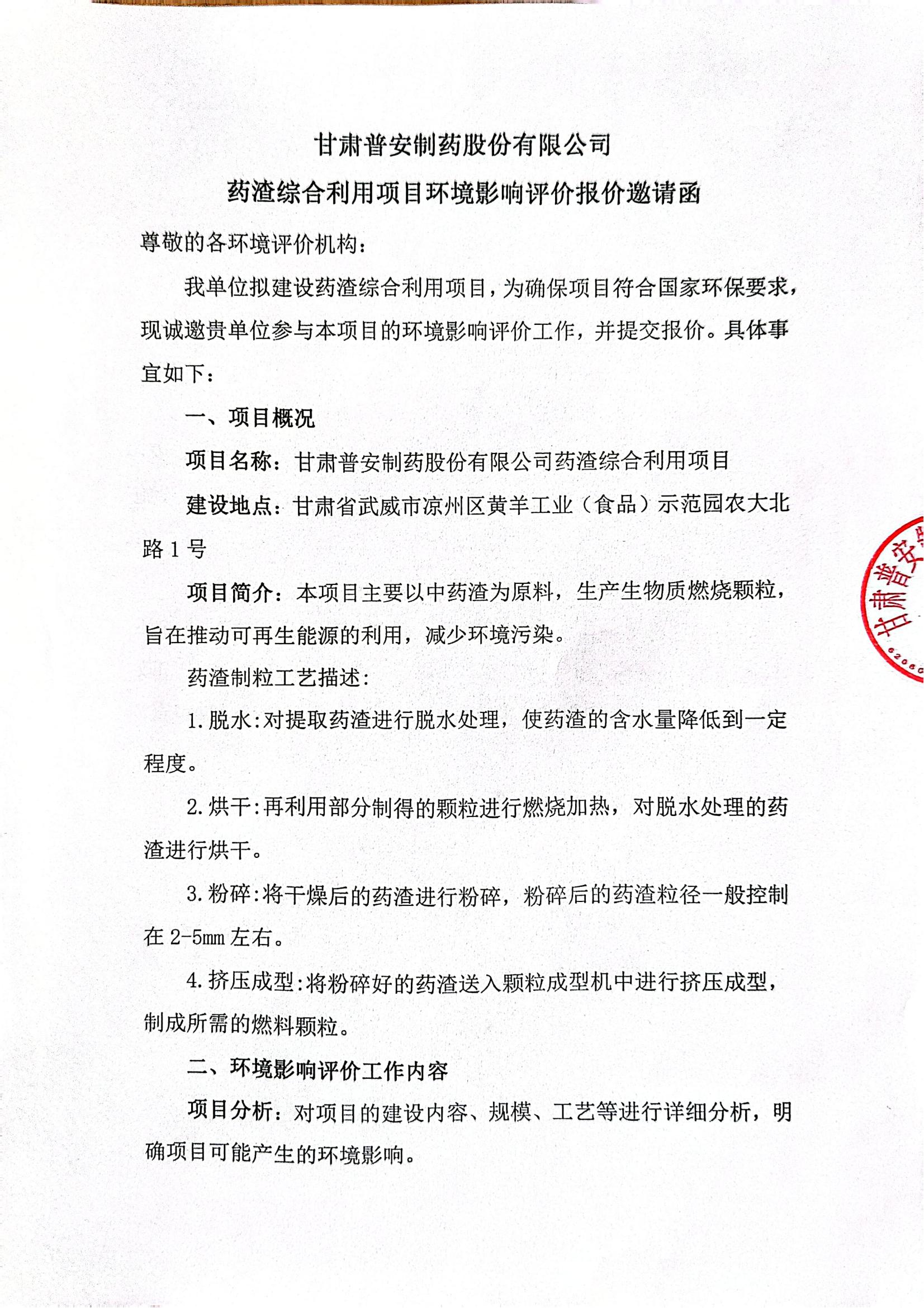 甘肅普安制藥股份有限公司藥渣綜合利用項(xiàng)目環(huán)境影響評(píng)價(jià)報(bào)價(jià)邀請(qǐng)函