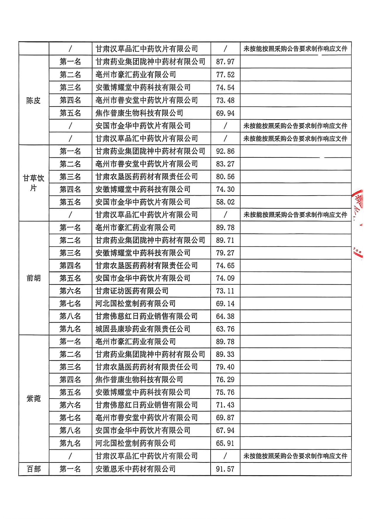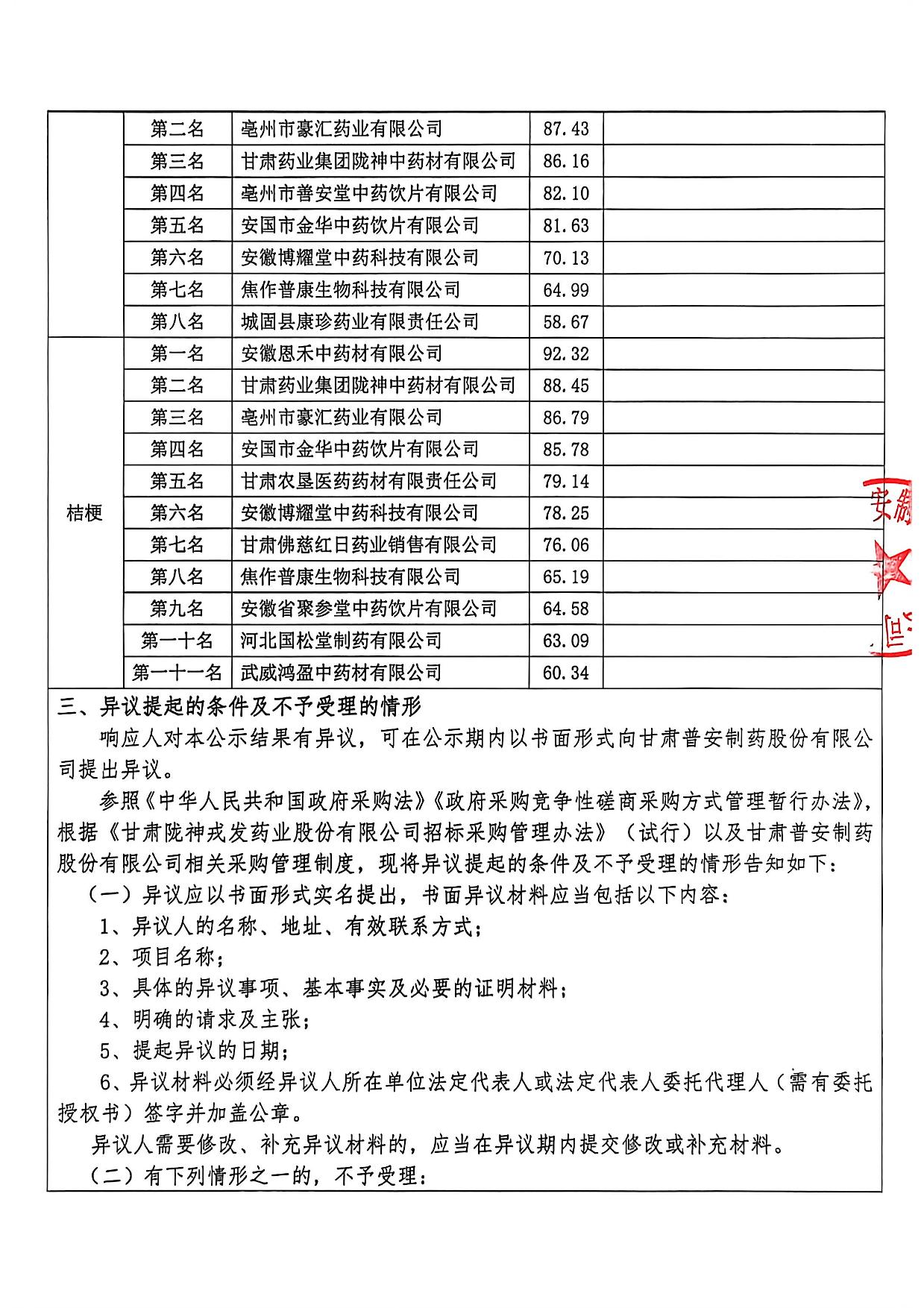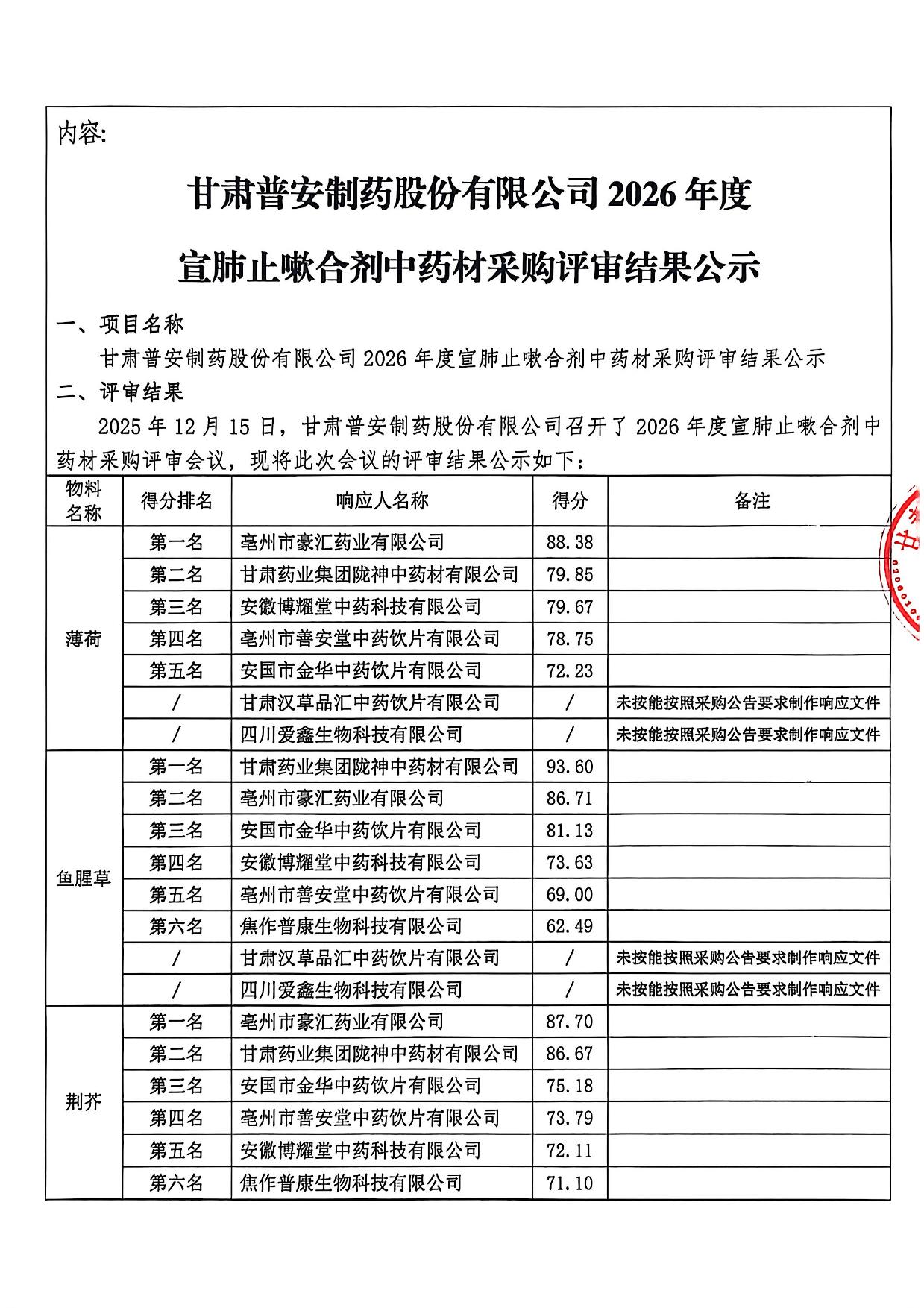 甘肅普安制藥股份有限公司2026年度宣肺止嗽合劑中藥材采購評審結果公示