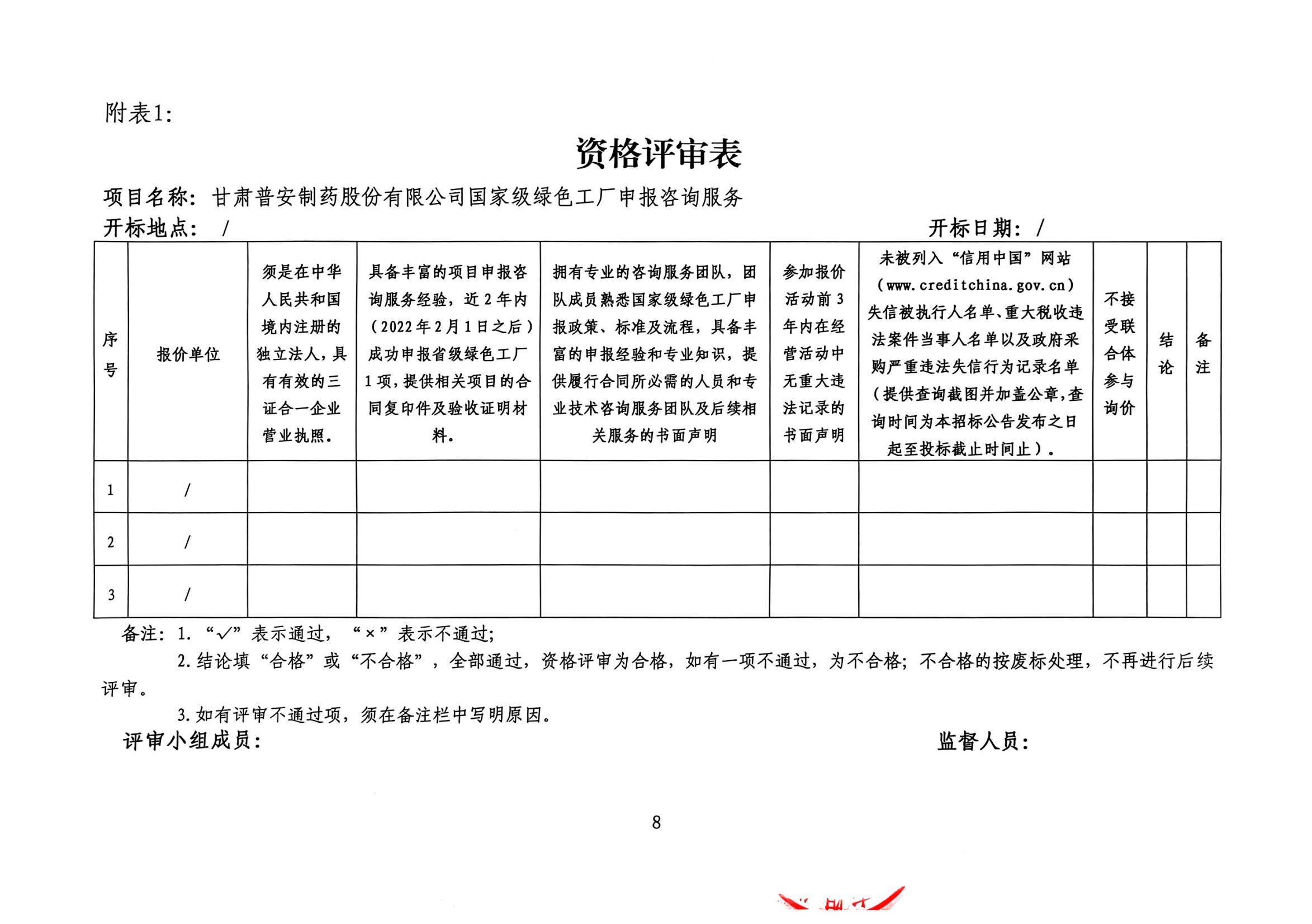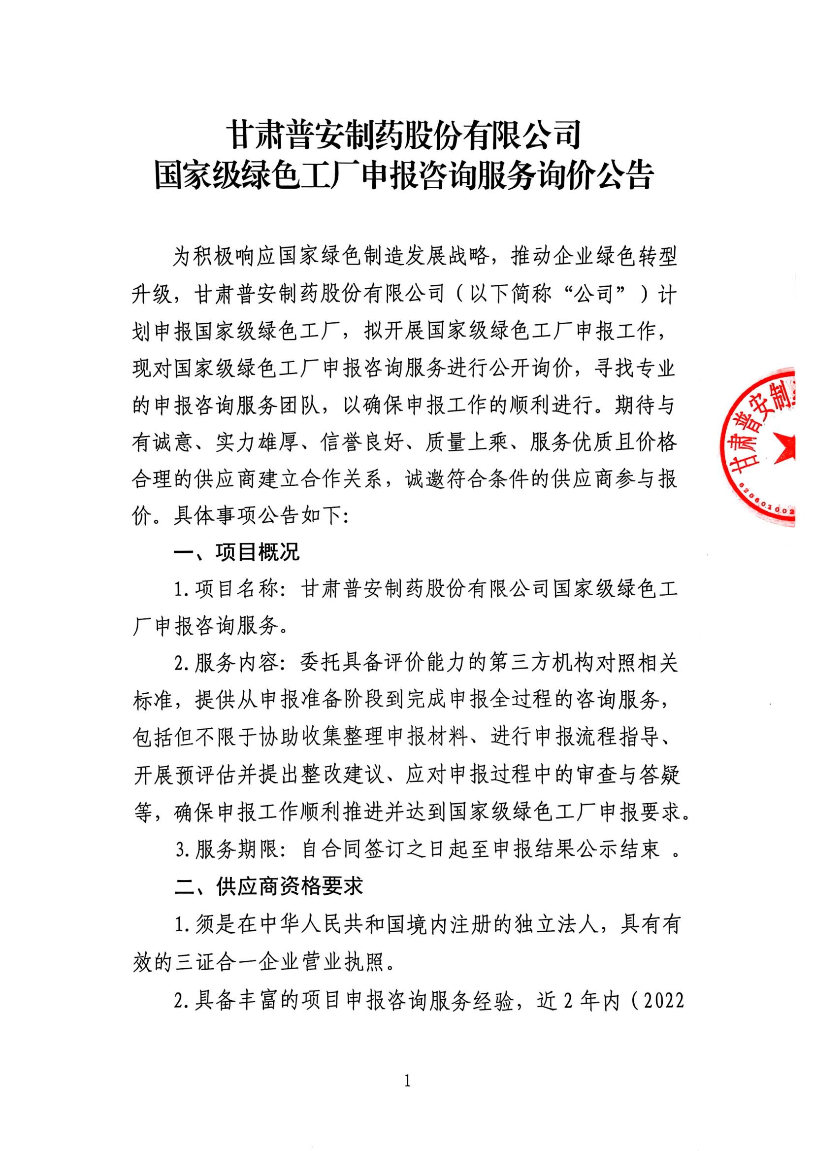甘肅普安制藥股份有限公司國家級綠色工廠申報咨詢服務詢價公告