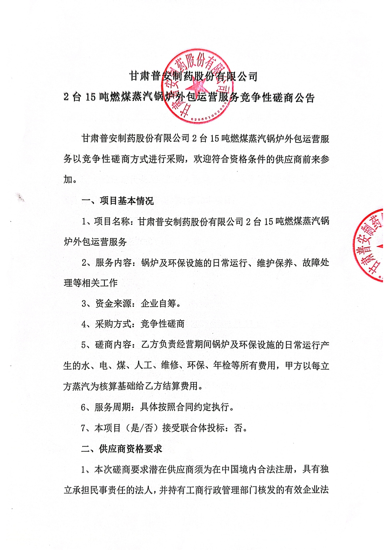 甘肅普安制藥股份有限公司2臺15噸燃煤蒸汽鍋爐外包運營服務(wù)競爭性磋商公告