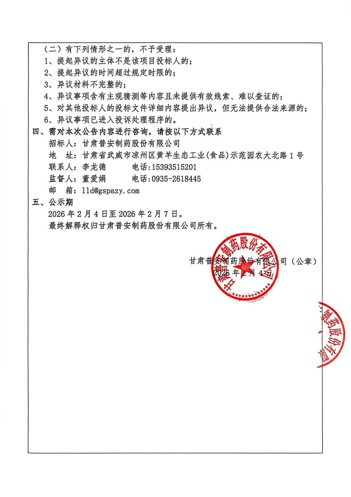 甘肅普安制藥股份有限公司2026年度 宣肺止嗽合劑輔料(蔗糖)評標結果公示